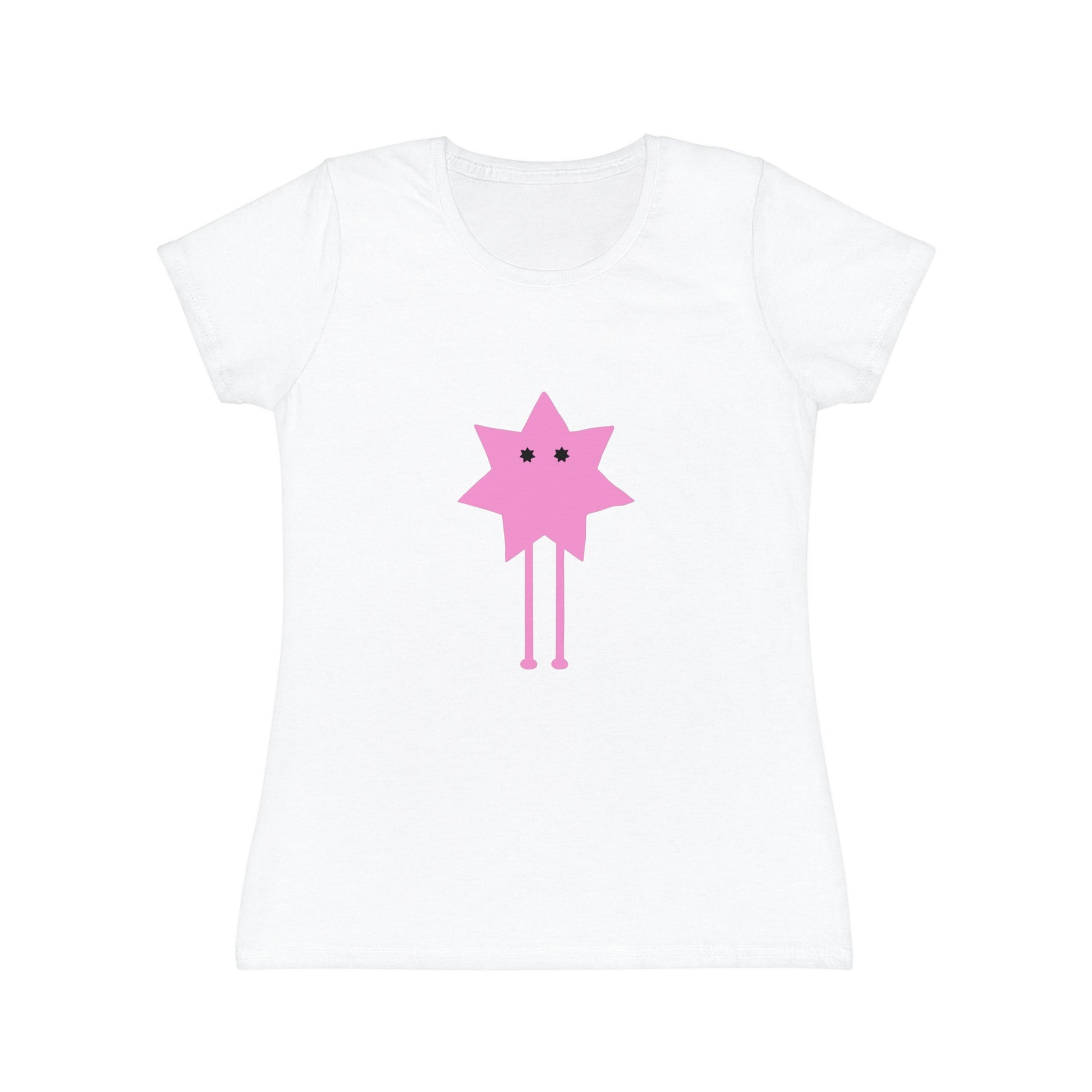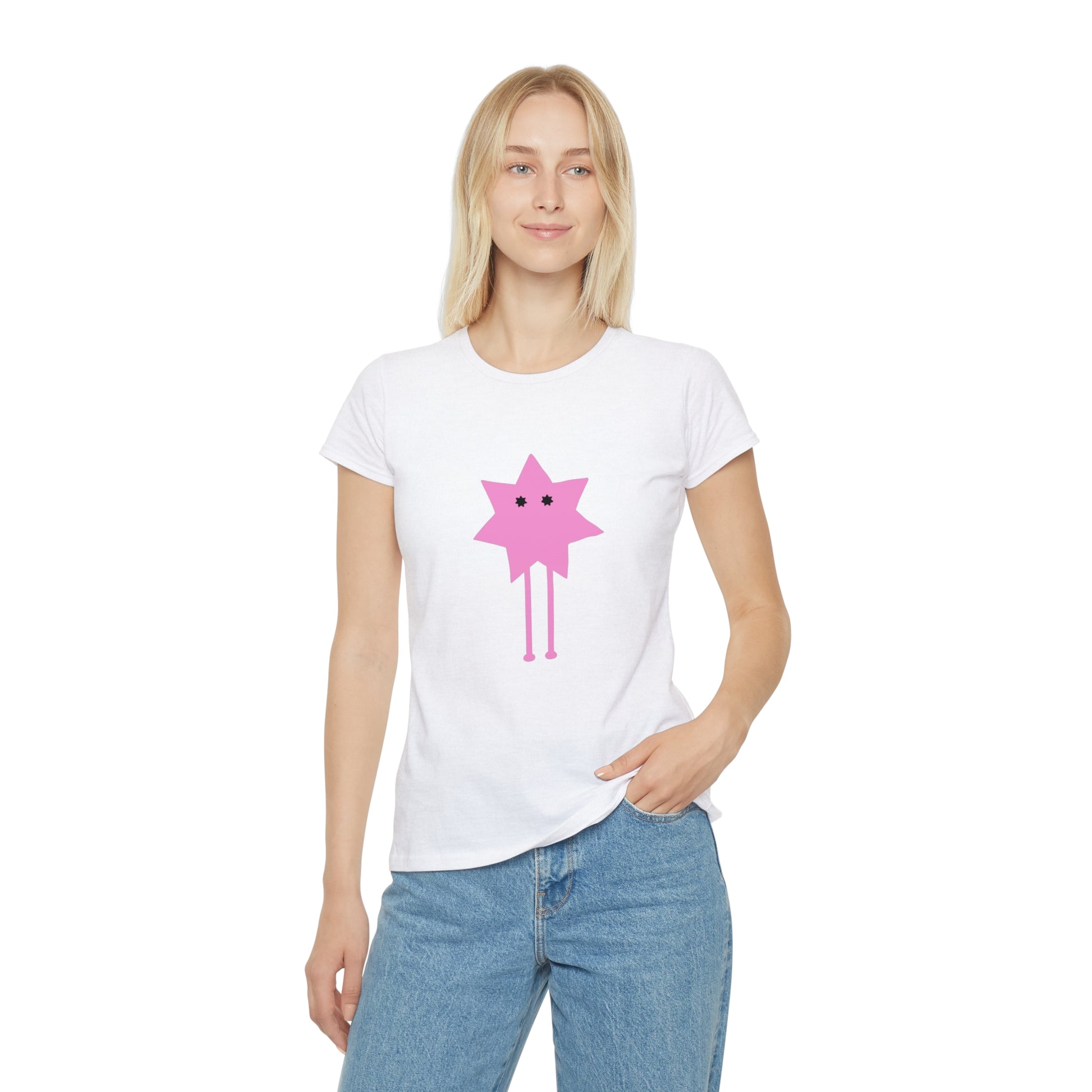 Soft, light, and playfully feminine — this fitted tee brings a touch of whimsical charm to everyday wear. The shirt’s slim, shaped side seams and gentle stretch collar create a flattering silhouette that moves with you. At the center, a simple pink star-like character with stubby legs and tiny eyes adds a quietly quirky personality: cheerful without shouting, sweet without being sugary. Wear it on relaxed mornings with jeans, layered under a cardigan for coffee dates, or tucked into a skirt when you want a low-key statement. The fabric feels breathable and airy, so it stays comfy through errands, studio time, or casual meet-ups.